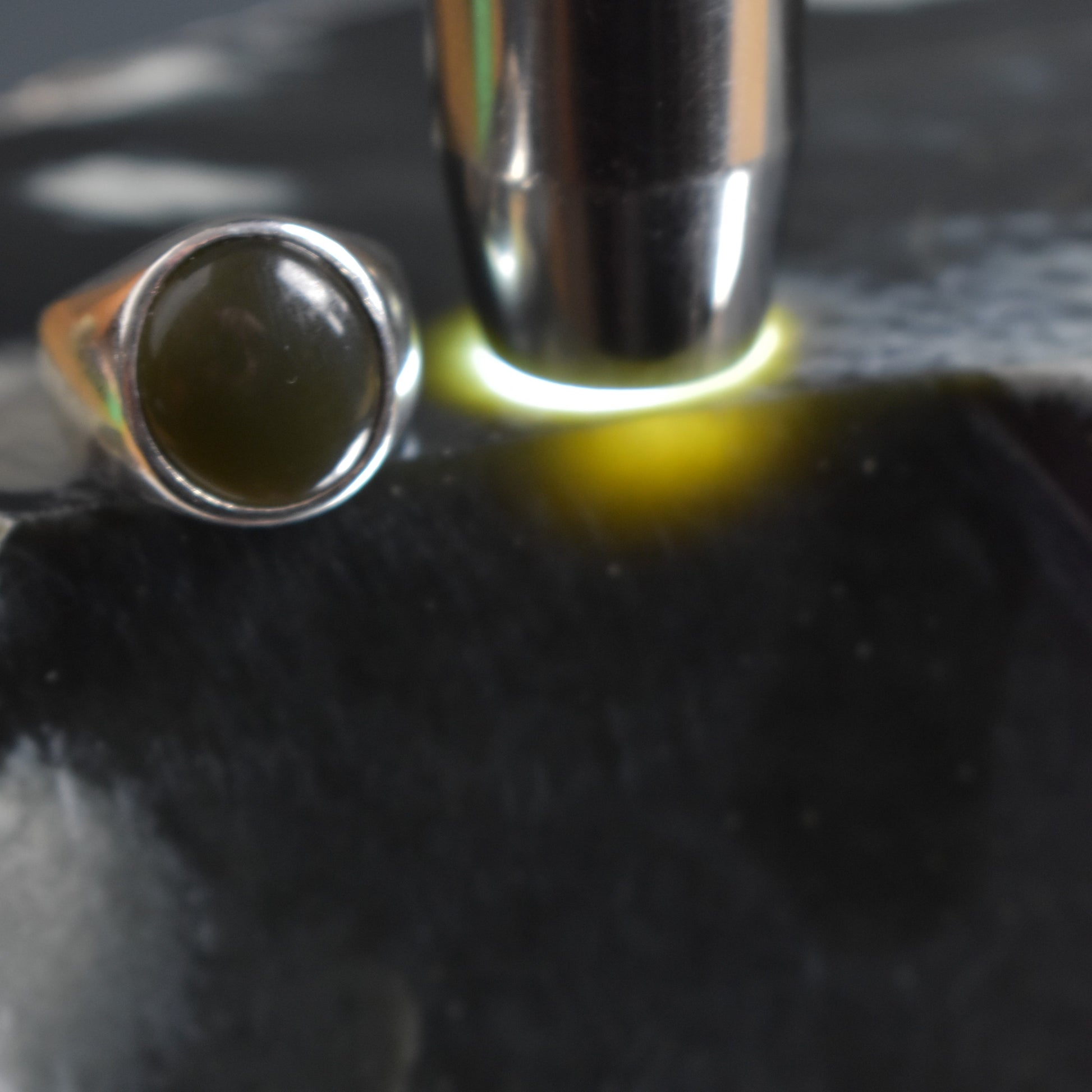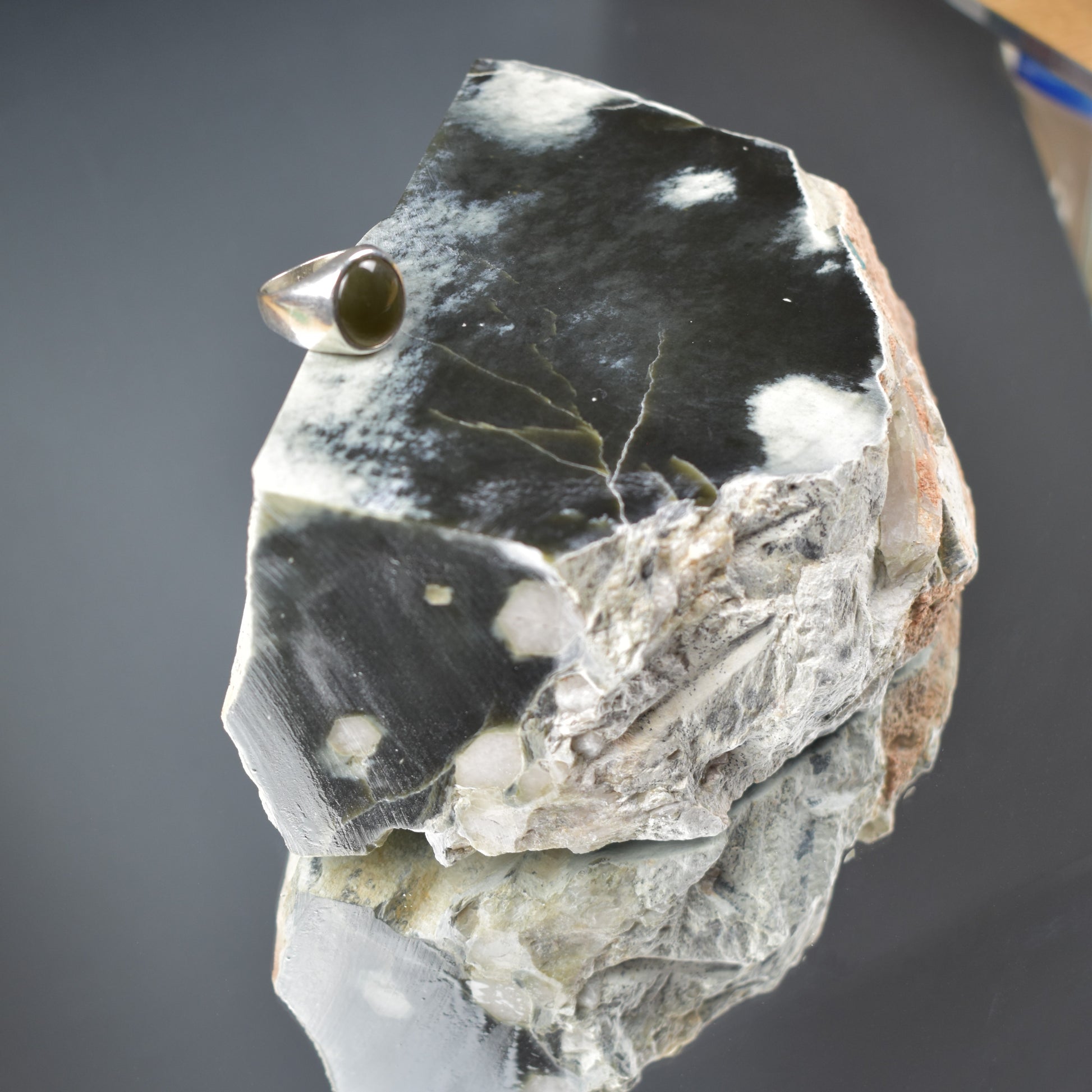 When photographed with ring for scale (not included), ring is size 10 and Sky Jade© cabochon is 8x10 mm.