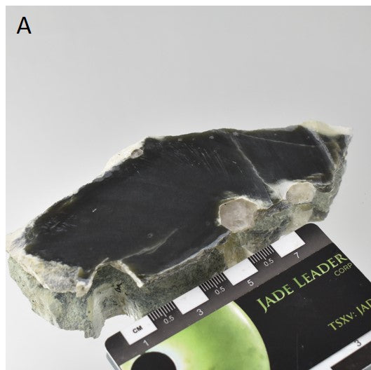 A: Slab front, wet (water), scale card. B: Slab front, dry, cabochon for scale. C: Slab back, rough surface, cabochon for scale. D: Jade light for color, texture and translucency