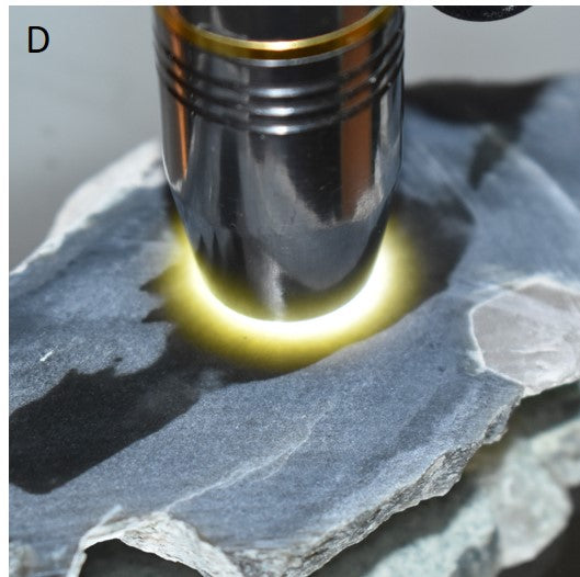 B and C are photographed with 13 mm round polished cabochon cut stone for scale/reference (not included).