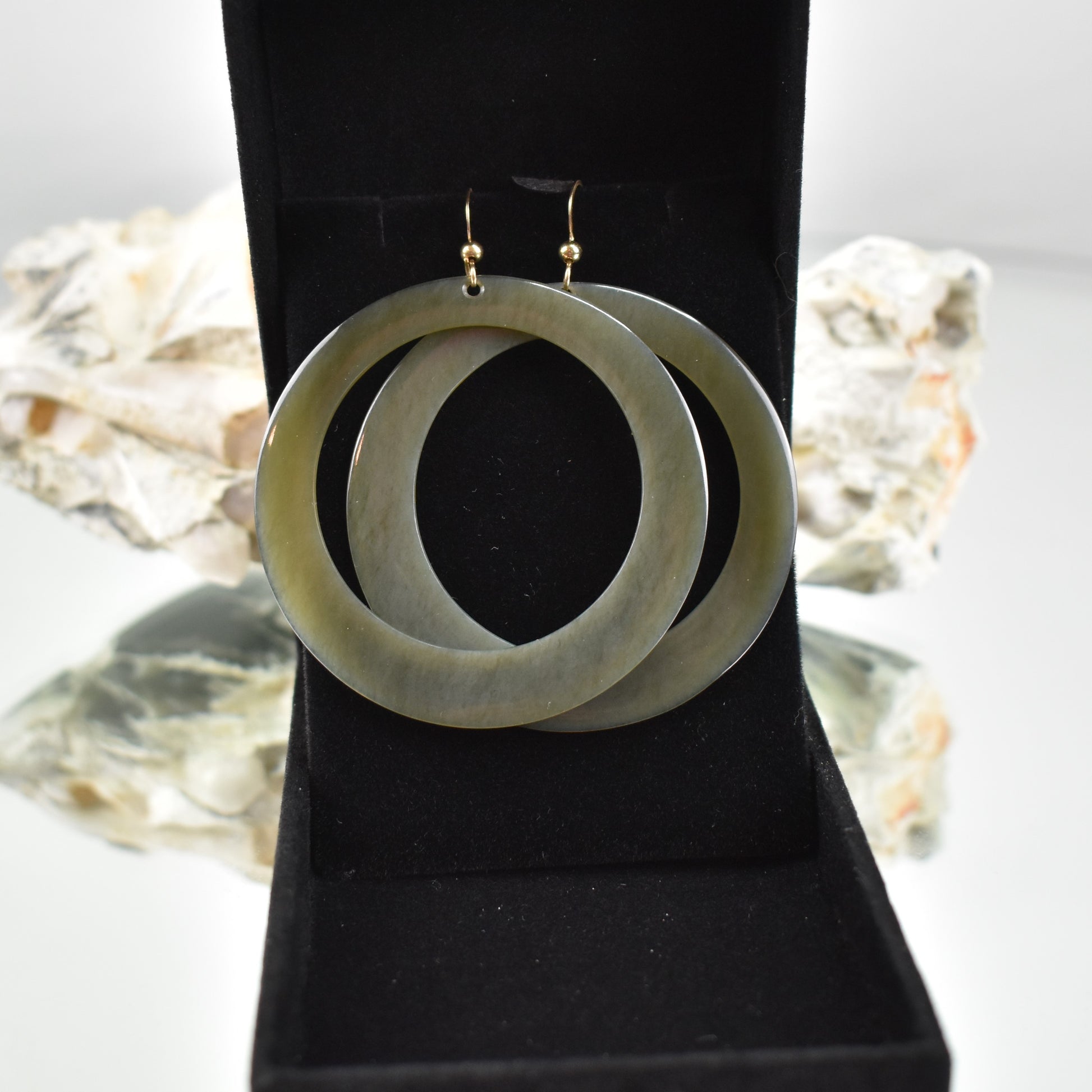 Large matched hoop earrings of thin Sky Jade©, with 14 kt gold ear hooks and accent gold bead. Each hoop has an outside diameter of 56.5 mm, Jade thickness is 1 to 1.5 mm, and each hoop weighs between 5 to 6 grams.