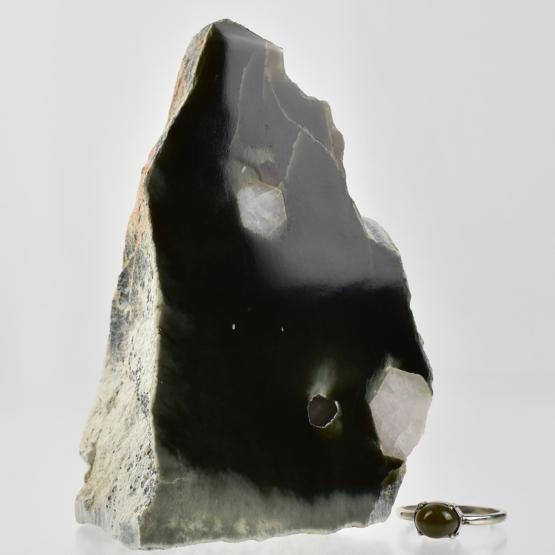 Specimen of fine, dark green Wyoming Sky Jade© with a large polished face showing numerous natural embedded quartz crystals growing in multiple directions and showing natural rind. Flow patterns of the crystallizing jade around the quartz are apparent.